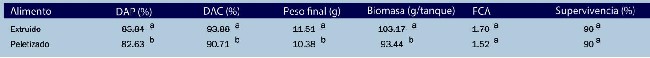 En una serie de estudios realizado por Skretting Ecuador, se logró identificar y comprobar los beneficios que otorgaba la alimentación de dietas con la misma formulación, pero diferente manufactura (extruidas y peletizadas); concluyendo que es posible aumentar significativamente la biomasa, peso final, digestibilidad de proteínas y carbohidratos, sin que se afecte significativamente el factor de conversión alimenticio (FCA) y la supervivencia (Tabla 1).