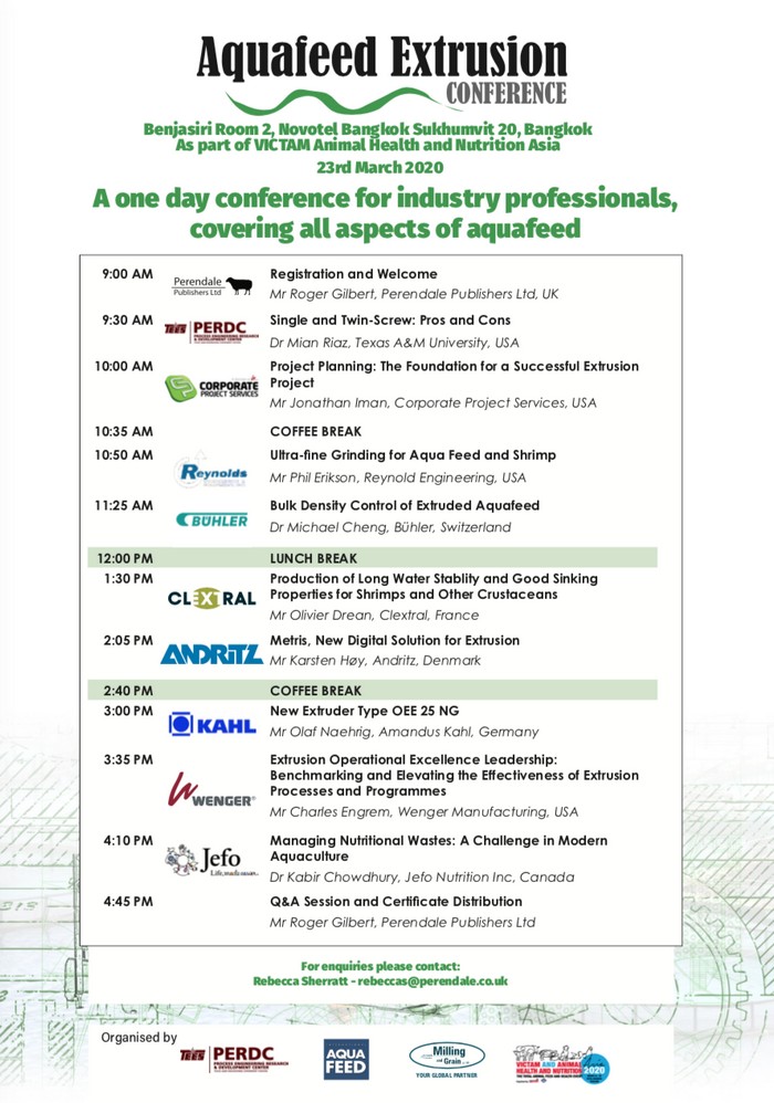 Esta edición de la conferencia se enfocará en extrusión para alimentos acuáticos, y se llevará a cabo de forma Online el 8 al 9 de Julio de 2020. La conferencia de dos días contará con una variedad de oradores expertos de la industria que ofrecerán presentaciones innovadoras sobre cómo los usuarios pueden hacer el mejor uso de su maquinaria de extrusión y sistemas de alimentación acuícola